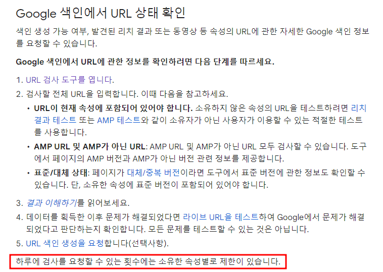 그래서 결론은 하루에 검사를 요청할 수 있는 횟수에 제한이 있다고 안내되어있지만 기준이 없으니 일일 할당량 초과 되었다는 경고문이 뜨면 시간차를 두고 다시 시도하면 정상적으로 수동 색인 요청이 된다는 것이다.