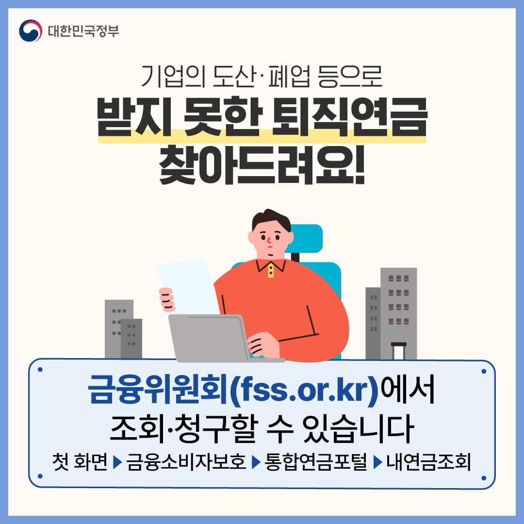 현재 퇴직연금 가입자는 금융감독원 홈페이지 '통합연금포털'을 통해 퇴직연금 제도별로 적립된 자신의 모든 퇴직연금 적립금을 조회 및 확인할 수 있다고 합니다. 근로자가 직장 폐업등으로 퇴직연금을 받지 못했을 경우 이 서비스를 이용하여 자신의 미청구 적립금 정보를 확인하고 확인됨 금융회사로 연락하여 신청서류들을 제출하면 연금을 되찾을 수 있다고 합니다.
